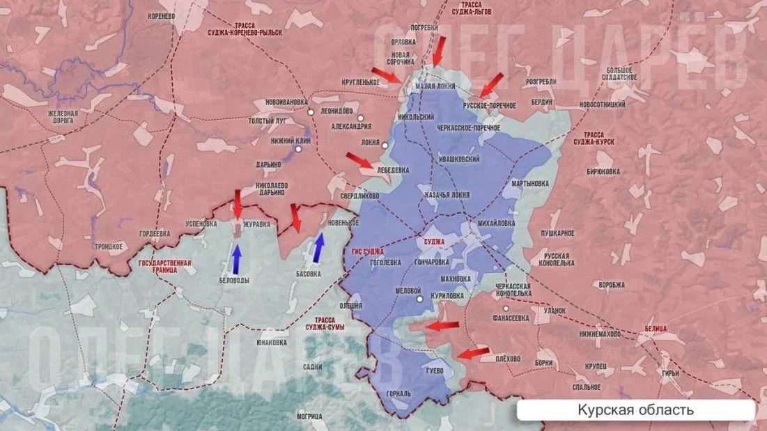 С запада от Суджи наши десантные части продвинулись в Журавке, большая часть которой под нашим контролем. У Новенького россияне пока закрепляются для дальнейшего прорыва на Басовку.