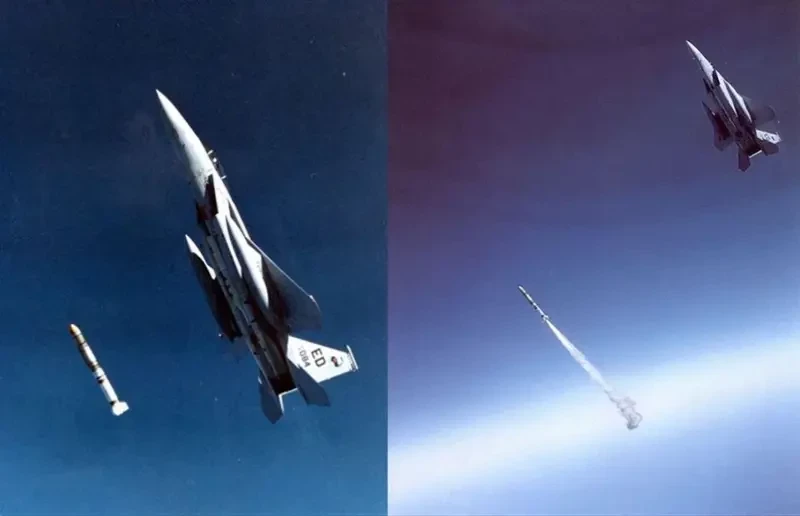 Ракета ASM-135 сразу после сброса с истребителя F-15A, пилотируемого майором Пирсоном, на пути к уничтожению спутника Solwind P-78-1 (слева) и запуск двигателя ракеты (справа).