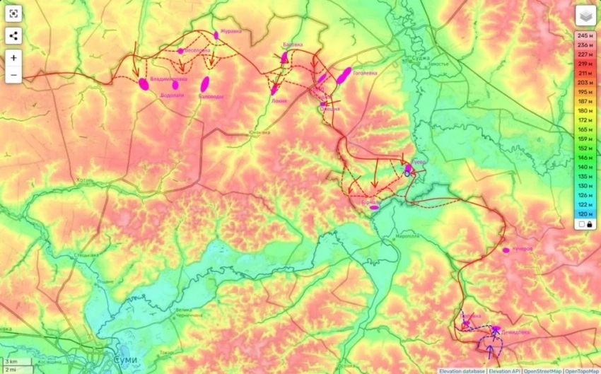 В свою очередь на Сумском направлении активная фаза боевых действий ведётся за населённые пункты Олешня и Горналь.