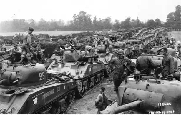 Танки M4 Sherman дивизии Леклерка на пляже «Юта», 1 августа 1944 г. (в том числе и машины 9-ой роты)