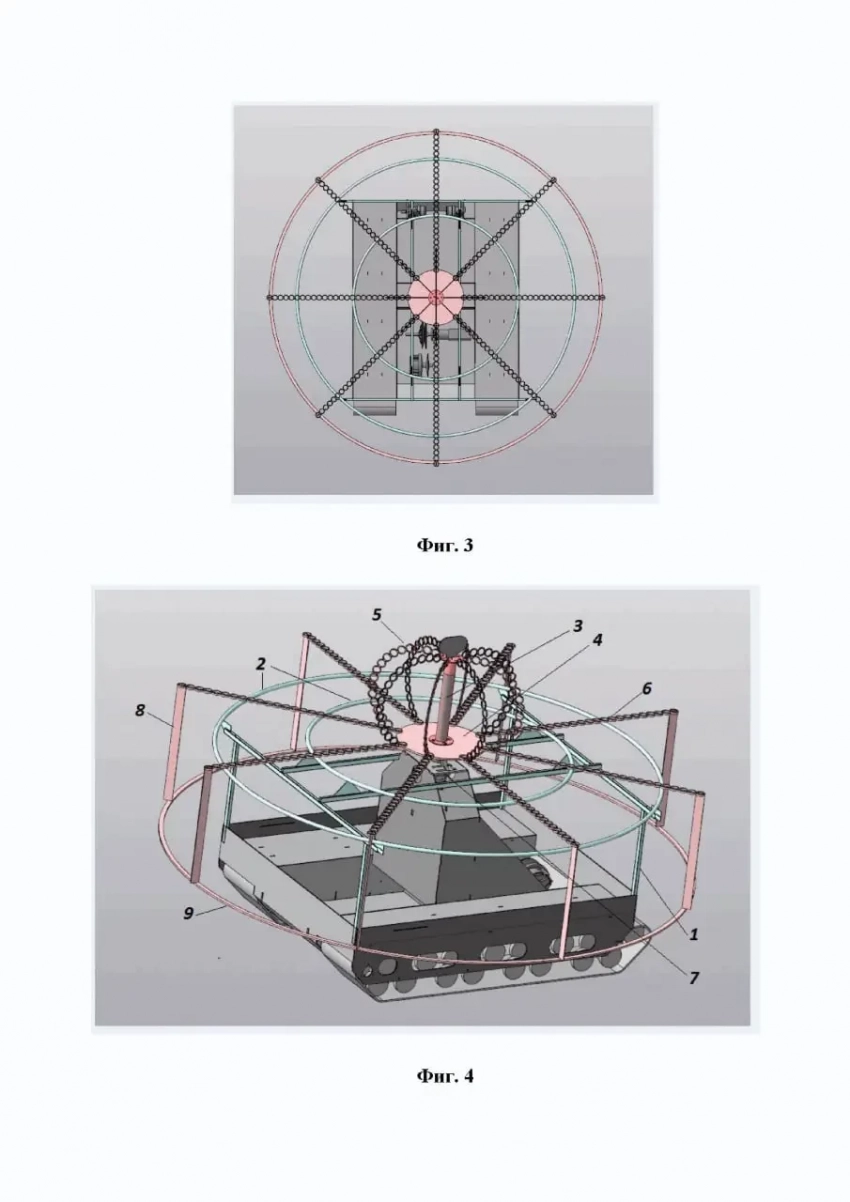 Нетривиальным вариантом защиты от FPV-дронов и сбросов можно считать различные вращающиеся элементы – цепи, лопасти, трубы и так далее. В одном из исполнений предлагается пространственная конструкция из труб с семью электромоторами и пропеллерами. Таким образом, автор пытается организовать круговую защиту от атакующих дронов. В качестве двигателя для пропеллеров, по всей видимости, можно использовать элементы БПЛА сельскохозяйственного назначения – в простонародье «Баба-Яга». Из описания патента: