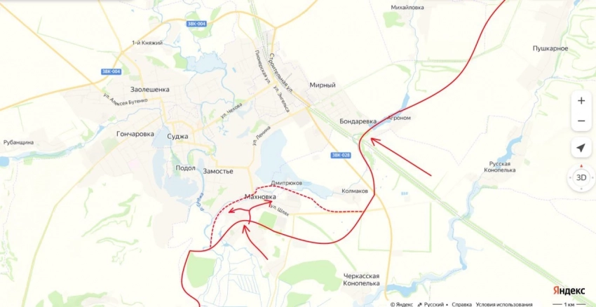 Вместе с этим российские войска завершили занятие посёлка Махновка, который фактически входит в Суджанскую агломерацию - группу сёл вокруг Суджи, слившихся в единую жилую застройку. Освобождение этого посёлка особенно важен, так как агломерация имеет развитую дорожную инфраструктуру с асфальтированными дорогами. Это позволит российским войскам продолжить наступление даже в условиях распутицы, отмечает Подоляка в своём Telegram-канале.
