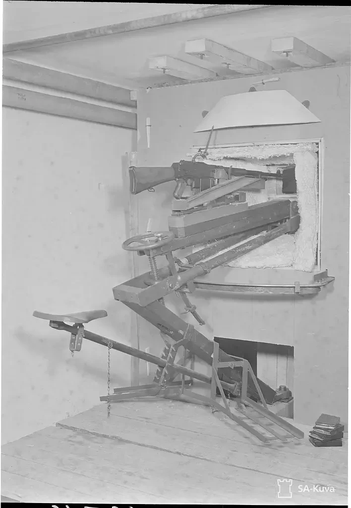 Что касается финских «устойчивых к осколкам» ДОТов, то они представляют из себя конструкцию посерьёзнее, уже из железобетона. И даже имеют какой-никакой станок и сиденье так называемого «велосипедного» типа. Финны использовали в них свои ручные пулемёты с воздушным охлаждением ствола «Лахти-Салоранта» L/S-26 и шведские пулемёты Kg m/21 — клоны американского BAR. Думается, в такой станок с небольшими доработками вполне можно было установить вообще любой ручной пулемёт.