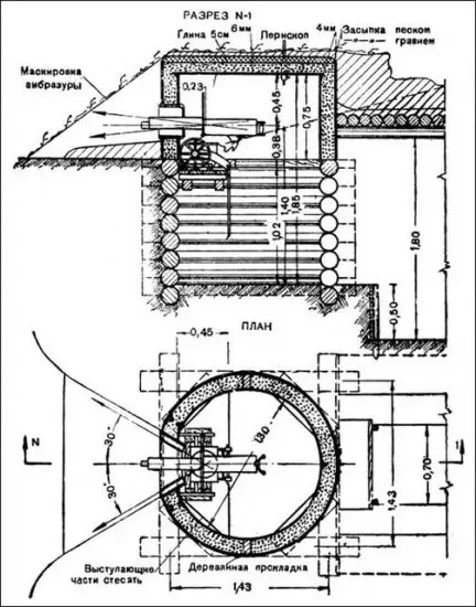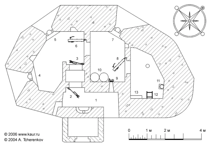 Что касается советских ДОТов, то у них, как правило, присутствует амбразура защиты входа. На схеме она под номером 9.