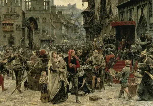 «Вальдемар Аттердаг собирает дань с жителей Висбю». Целью Вальдемара на протяжении всего его 35-летнего правления было восстановление королевства Дания, которое фактически распалось при его предшественниках. И для этого ему нужны были деньги. А деньги эти он получал из двух источников: налога на торговлю сельдью и пошлины за проход через пролив Эресунн. Для пополнения своей казны датский король Вальдемар IV в 1361 году решил напасть на шведский остров Готланд, где находился купеческий центр — город Висбю. Захватив город, Вальдемар установил на площади три большие пивные бочки и сообщил горожанам, что если бочки не будут наполнены серебром и золотом в течение трех дней, то город будет отдан на разграбление его армии. Художник: Карл Густав Хелквист (Carl Gustaf Hellqvist, 1851–1890).