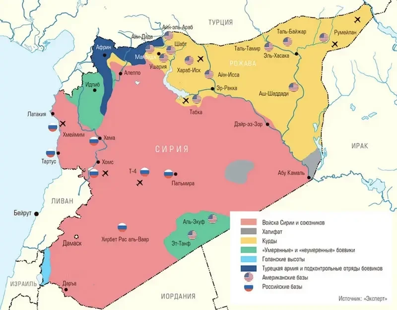Карта с зонами контроля США и России в Сирии