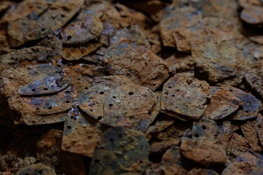За два года лабораторных раскопок археологическая группа отсортировала и подсчитала почти 7000 отдельных чешуек доспехов. Найденные следы лака указывают на то, что доспехи и мечи хранились вместе в больших лакированных ящиках, которые со временем истлели, оставив после себя свое содержимое.