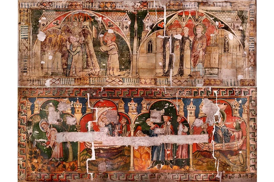 В 1984 году реставраторы начали удалять побелку, сложный процесс, на завершение которого ушло десятилетие из-за ограниченного пространства, в котором им приходилось работать — щель шириной в несколько футов между задней частью деревянной обшивки и стеной 13-го века. Реставрация обнаружила готические масляные картины в насыщенных пигментах киновари, медно-зеленого, лазурита и свинцовых белил. Яркость цветов и исключительное качество дизайна относят их к лучшим, если не к лучшим фрескам такого рода второй половины 13-го века во Франции.