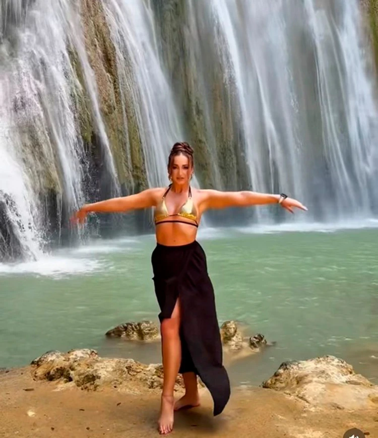 Кокетка Бузова позирует на фоне водопада, демонстрируя аппетитные формы. Кстати, у нас с Ольгой одинаковые купальники от российского бренда «Дефиле». Эффектное золотое бикини сейчас можно приобрести на распродаже всего за 1500-2000 рублей! Образ звезда дополнила юбкой-парео и крупными золотистыми серьгами в тон купальника. Плюс сделала укладку, с которой, конечно, особо не поплаваешь, но для фото в самый раз.
