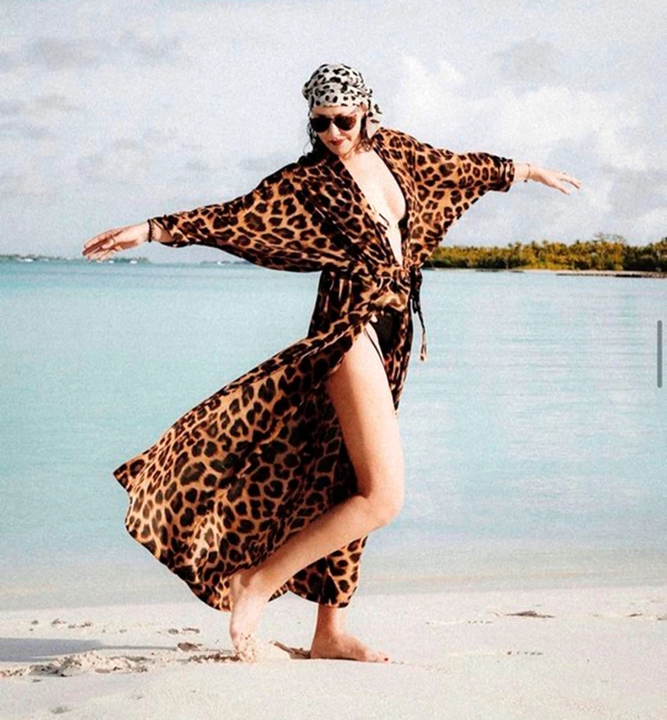 Ксения Анатольевна нам напоминает, что леопардовый принт никогда не выйдет из моды. И я с ней согласна! Кроме того, анималистичные рисунки смотрятся особенно эффектно на пляже. Собчак сочетала «хищную» накидку с пятнистым платком, который она повязала на голову, как тюрбан. Кстати, леопардовый кафтан у Ксении от московского бренда Leur. Цена накидки — 29 000 рублей. Как-то даже скромно Для Собчак, у которой только брюки могут стоить полмиллиона.